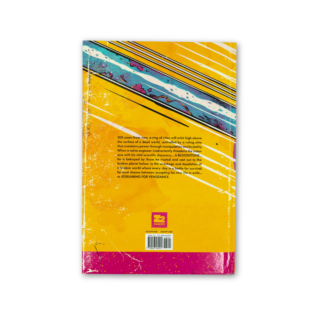 500 years from now, a ring of cities will orbit high above the surface of a dead world, controlled by a ruling elite that maintains power through manipulation and brutality. When a naïve engineer inadvertently threatens the status quo with his vital scientific discovery… A BLOODSTONE... he is betrayed by those he trusted and cast out to the broken planet below. In the wreckage and desolation of a broken world where every day is a battle for survival, he must choose between accepting his new life in exile… or SCREAMING FOR VENGEANCE.